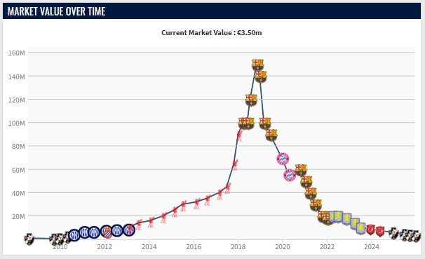库蒂尼奥生涯最高身价曾在2018年达到1.5亿欧,之后一路下降,7年后如今只剩350万欧。